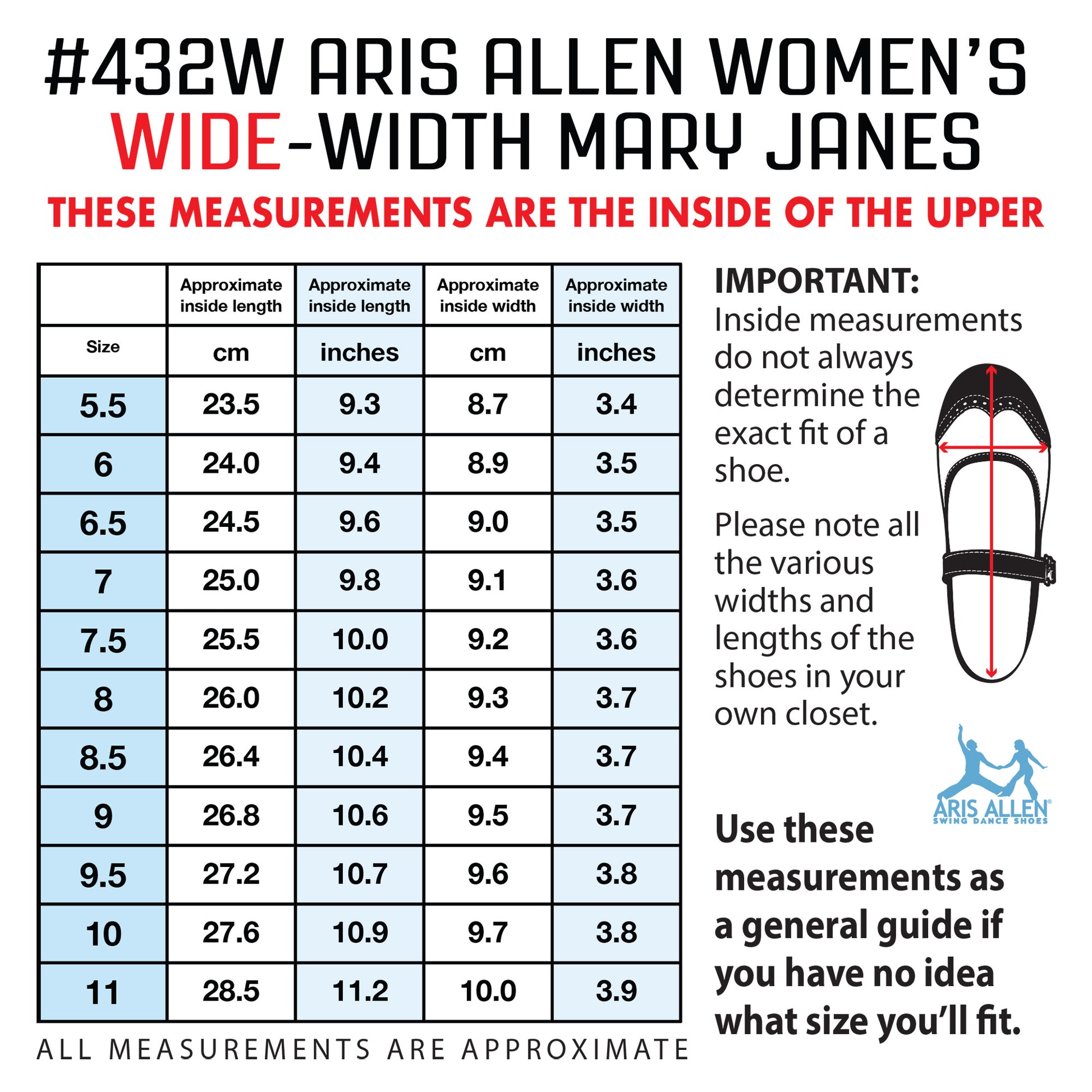 CHECK THE PHOTOS FOR OUR CHART WITH MEASUREMENTS (measurements of the inside of the actual shoe - NOT the measurements of your foot). These are rounded toe shoes. The end of the toe will be closer to your toes than in most shoes. When you are wearing the correct size the slightly shorter length literally gives you better agility on the dance floor.
